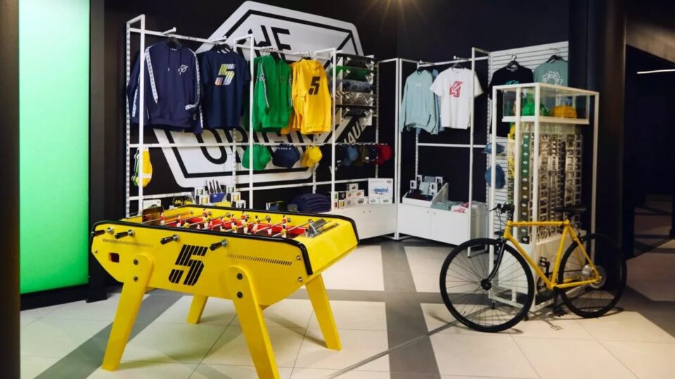 The focus of the opening has been on the interior design and attracting the traffic from Soho and neighbouring Carnaby Street. Huge panels of glazing have been installed in its front facade to encourage passers-by to look in and observe the store’s brightly coloured aesthetic. The blue, red, and yellow colour scheme is intended to mimic the brightly-hued pavements of London’s Carnaby Street during the 1970s.