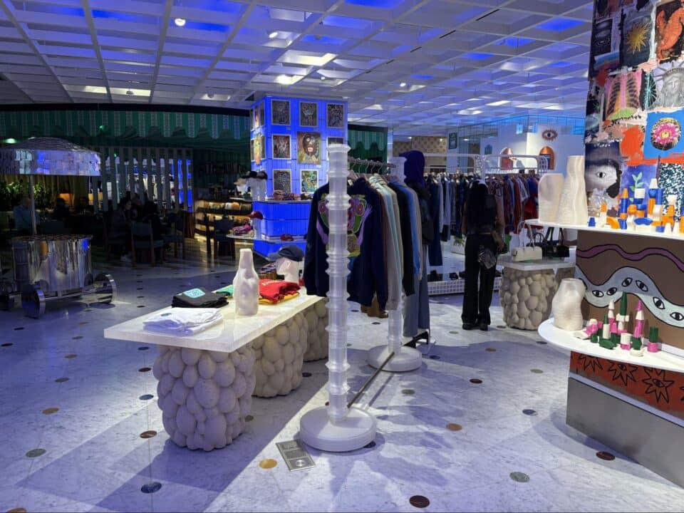 So, a tiled green bathroom, called the Apothecary, contained beauty products and a bedroom space, with large lace style installations, created a dream-like quality. Called the Red Room, this space contained footwear and collaborations. The Playroom features clothing, gifts and a café, is designed with playfulness in mind, containing sculptures and light installations.