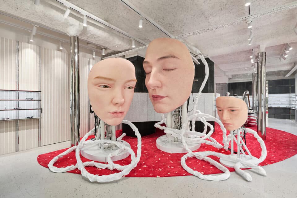 The brand is also known for its individual and iconic retail store designs, incorporating surreal sculptures and displays. The Paris store has also been designed by the brand’s in-house team, with a range of robotic moving sculptures that customers see as they first enter the store. This includes the Giant Head Kinetic Object, made up of three faces that are able to move, and Star, which creates a sunlike glow with reflective light. There are also a range of LED screens throughout the store which display the brand’s products.