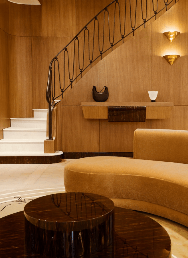 The store design is from Parisian architects Le Cann, who have created a sophisticated and luxury backdrop, with a spiral staircase, plush curved seats, and art pieces from French women artists.